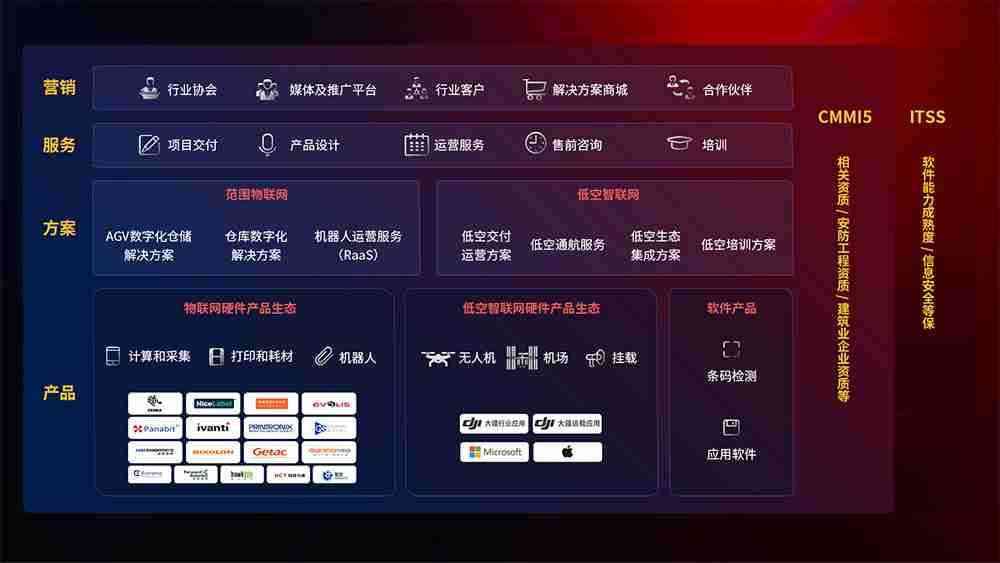 聚合国内外先进的物联网硬件产品品牌,,,聚焦数字化仓储、、、、机器人运营、、低空智联网等领域,,共同打造适合客户业务场景的解决方案并提供交付服务