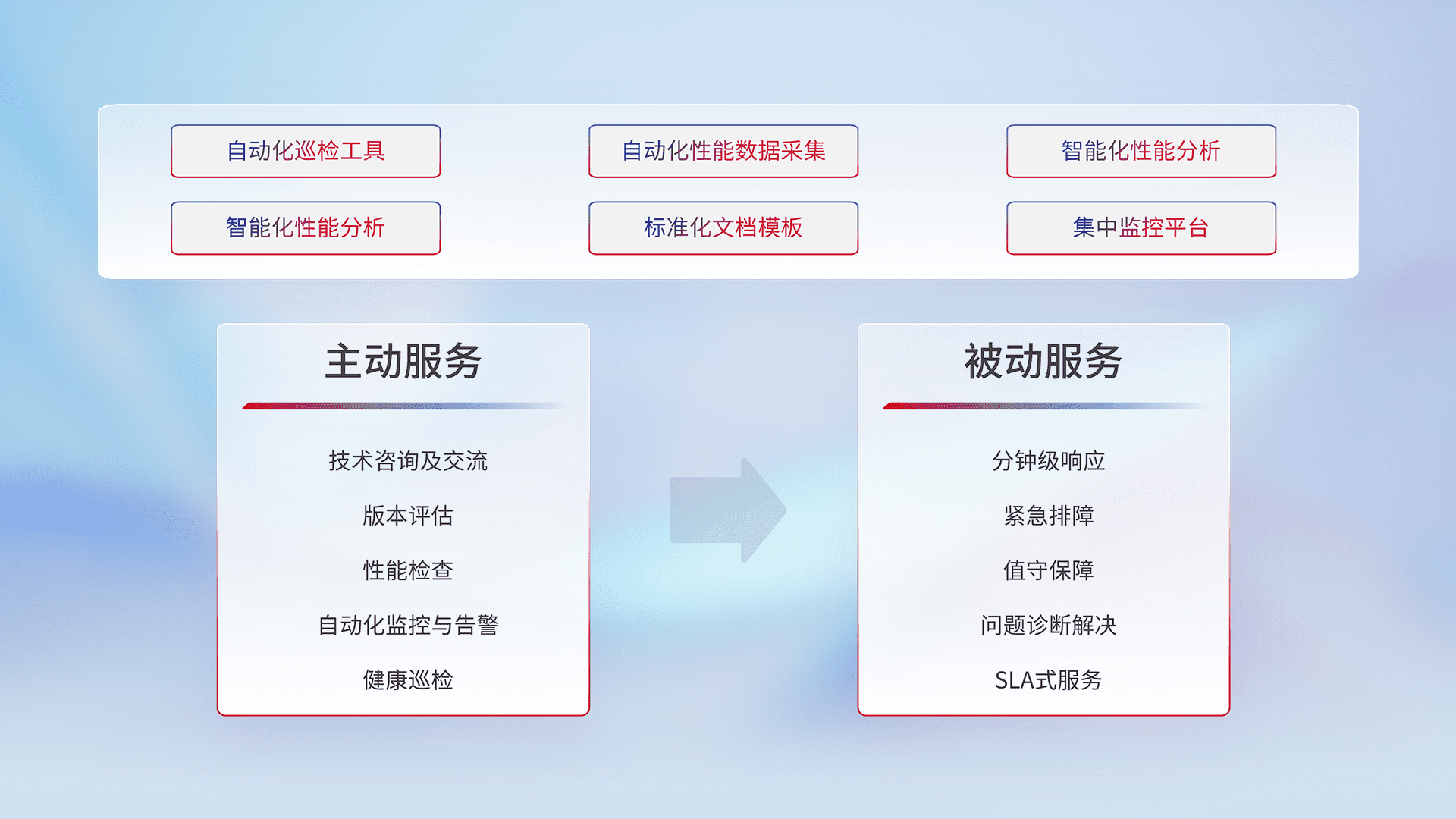 智能化工具和标准化文档,,,,保障服务质量,,提供主动服务(包含技术咨询、、版本评估、、、、性能检查、、自动化监控与告警、、健康巡检)和被动服务包含(分钟级响应、、、、紧急排障、、、值守保障、、、、问题诊断解决、、SLA服务)。。。。