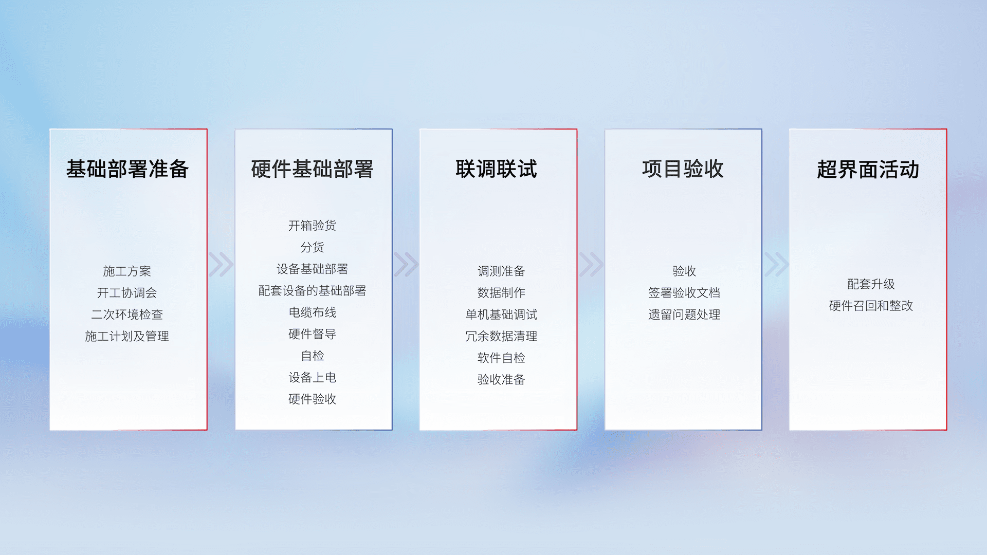 从基础部署准备、、硬件基础部署、、、、联调联试、、、项目验收、、、、越界面活动的全过程可追溯,,,,保证施工质量和进度。。